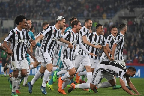 | Les joueurs de la Juventus, vainqueurs de la Coupe d'Italie, face à l'AC Milan au stade olympique de Rome, le 9 mai. |