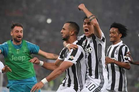 | La Juventus a surclassé l'AC Mila, avec notamment un but de Medhi Benatia, félicité par Paulo Dybala (N°10) et Juan Cuadrado, le 9 mai à Rome. |