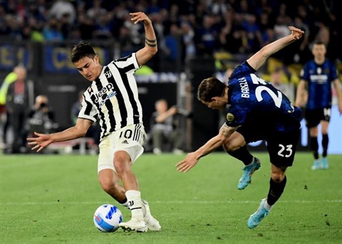 | L'attaquant argentin de la Juventus, Paulo Dybala (gauche), devance le milieu de l'Inter, Nicolo Barella ,en finale de la Coupe d'Italie, le 11 mai à Rome. |