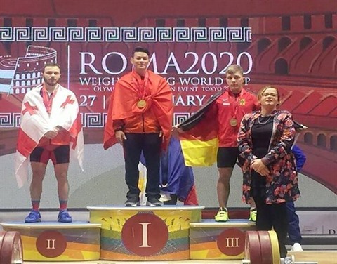 | Le Vietnamien Thach Kim Tuân (centre) remporte la médaille d'or lors de la Coupe du monde d’haltérophilie tenue du 26 au 29 janvier à Rome. |