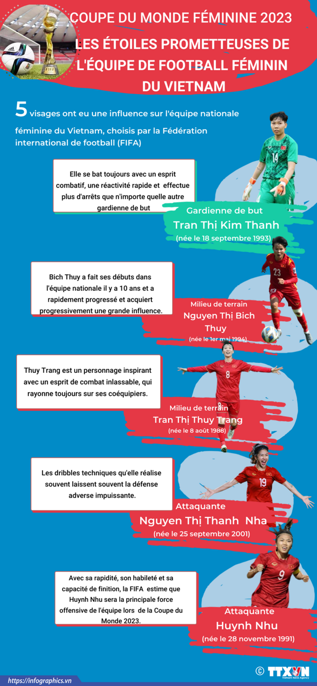 La Fédération internationale de football (FIFA) a choisi cinq joueuses ayant une influence dans l'équipe de football féminin du Vietnam qui participe pour la première fois à la plus grande compétition de football féminin - Coupe du monde féminine de football 2023.