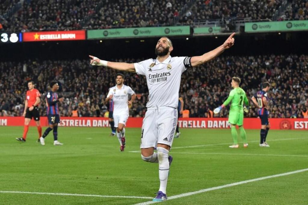 | Le capitaine du Real Madrid, Karim Benzema, auteur d'un triplé contre le FC Barcelone, en demi-finale retour de Coupe du Roi, le 5 avril au Camp Nou. |