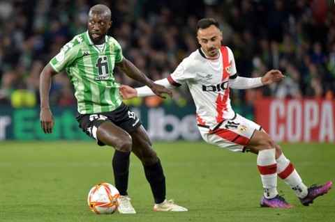 | Le défenseur du Real Betis, Youssouf Sabaly (gauche), devance le milieu du Rayo Vallecano, Alvaro Garcia Rivera, en demi-finale retour de la Coupe du Roi, le 3 mars à Séville. |