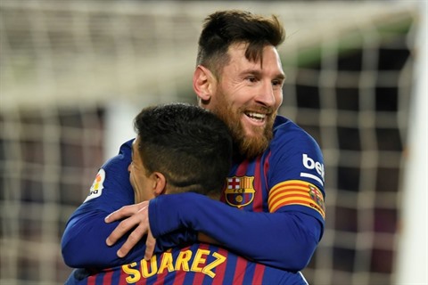 | Lionel Messi saute au cou de son coéquipier Luis Suarez après avoir marqué contre Séville, le 30 janvier au Camp Nou. |