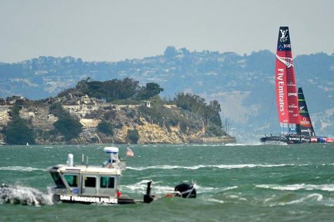 | Emirates Team New Zealand lors de la Coupe Louis-Vuitton dans la baie de San Francisco le 19 août |