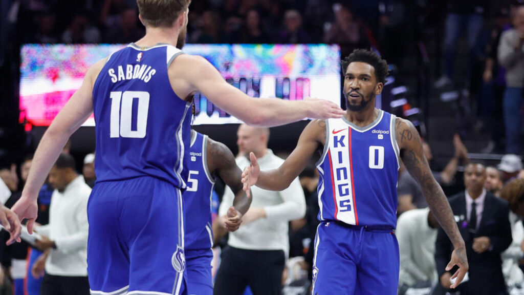 | Les joueurs des Kings, Domantas Sabonis et Malik Monk, lors de leur victoire contre les Golden State Warriors, le 28 novembre à Sacramento. |