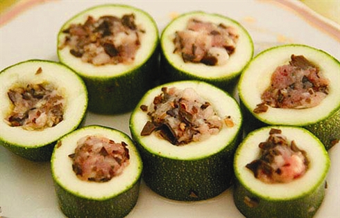 Recette expérimentale (mais il n’y a pas de raison pour que ça ne marche pas, c’est juste une variante des courgettes farcies françaises). Pour les connaisseurs, il suffit de faire une farce pour banh cuôn (crêpes vietnamiennes... à la recette jalousement gardée).