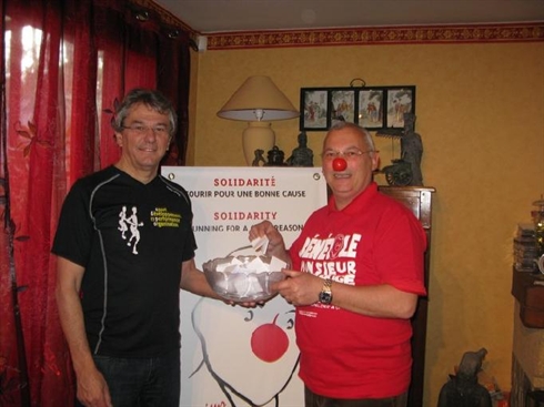 | Jean-Claude Le Cornec, président-fondateur de SDPO (gauche) et le symbole du Monsieur Nez Rouge de la course. |