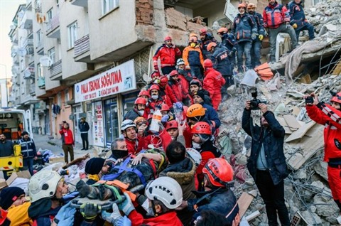 | Des sauveteurs évacuent le 25 janvier une femme blessée des décombres d'un immeuble après le séisme qui a frappé le 24 janvier Elazig, en Turquie. |
