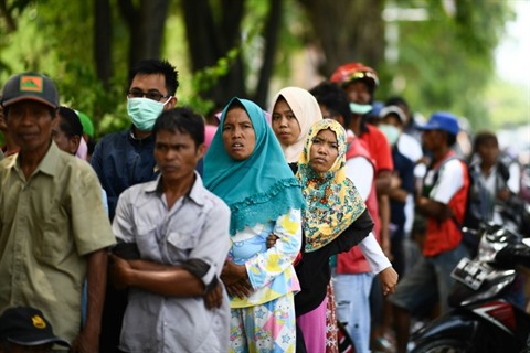 | Des habitants de la zone touchée par le séisme et le tsunami font la queue pour recevoir une aide, le 4 octobre à Palu, en Indonésie. |