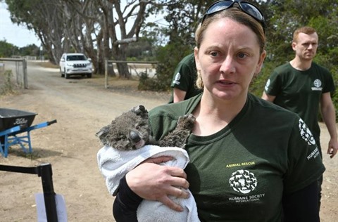 | Kelly Donithan, spécialiste de la gestion de crise pour l'organisation de défense des animaux Humane Society International, porte un koala blessé, le 15 janvier sur l'île Kangourou, en Australie. |