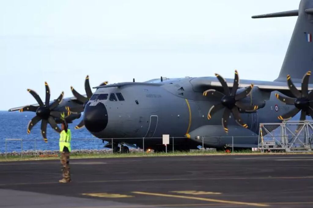 | L'avion militaire français A440M acheminant des pompiers et secours français à Mayotte atterit à Saint-Denis de la Réunion, le 15 décembre. |