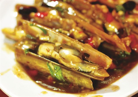 - Allumer le feu. Dans un wok, chauffer deux cuillères à soupe d’huile et faire revenir l’ail jusqu’à une coloration légère. Versez dans le wok les couteaux. Faire sauter 8-10 minutes, le temps que la chair cuise, et ensuite ajouter citronnelle, piments, hat nêm (2 cuillères à soupe), un peu de poivre. Sauter encore quelques minutes. Éteindre le feu.
