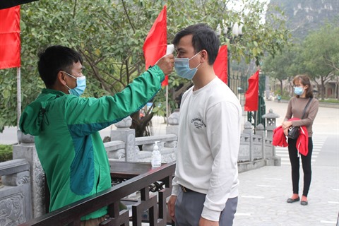 | Contrôle sanitaire à l'entrée du complexe passager de Tràng An, province de Ninh Bình (Nord). |