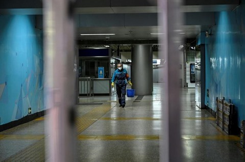 | Une station de métro du quartier d'affaires de Pékin, passablement désertée le 4 mai en raison de la politique zéro COVID. |