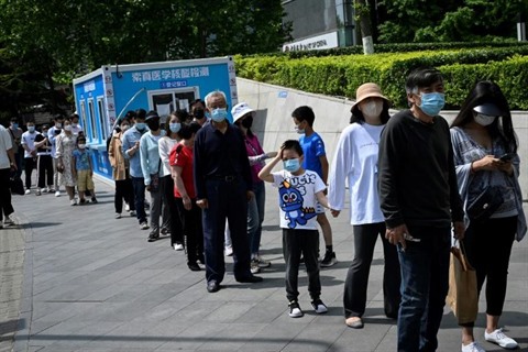 | File d'attente devant un centre commercial de Pékin pour se plier à un dépistage massif contre le COVID-19 le 5 mai. |