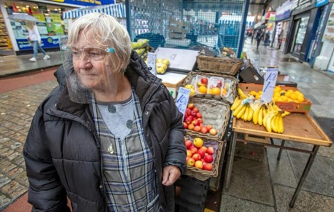| Une vendeuse de fruits et légumes porte un visière de protection, le 19 octobre à Dublin (Irlande). |