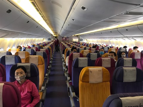 | Des citoyens vietnamiens dans un avion de Thai Airways pour retourner à leur pays natal. |