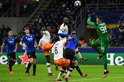 | Le gardien italien de l'Atalanta, Pierluigi Gollini, s'impose dans les airs face aux attaquants de Valence, le 19 février à Milan. |