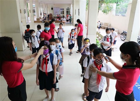 | Contrôle de la température corporelle d’élèves avant leur entrée en classe à l'école primaire de Nghia Tân, dans l'arrondissement de Câu Giây à Hanoï. |