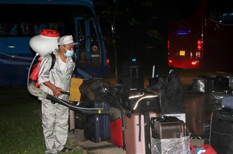 | Désinfection de bagages dans une zone de quarantaine à Hoà Binh (Nord), le 2 mai. |
