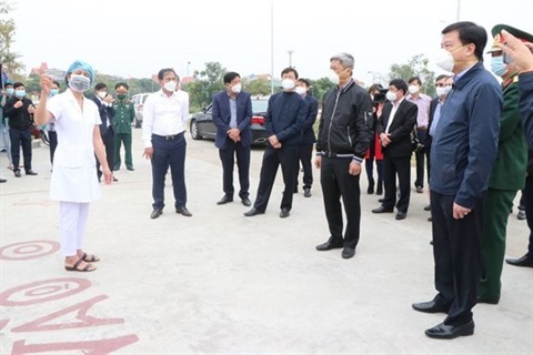 | Des responsables inspectent les travaux de prévention et de lutte contre le COVID-19 dans le district de Câm Giang à Hai Duong ̣(Nord). |