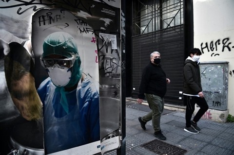 | Deux personnes masquées passent à côté d'une affiche représentant une infirmière elle aussi masquée, à Thessalonique (Grèce), le 2 janvier. |