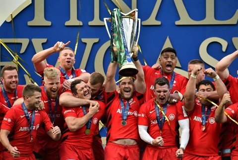 | L'équipe anglaise des Saracens lors de son dernier sacre en Coupe d'Europe de rugby, le 11 mai 2019 à Newcastle. |