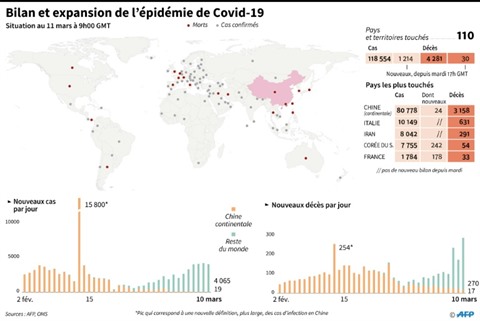 | Bilan et expansion de l'épidémie de COVID-19 dans le monde, au 11 mars à 9 h GMT. |