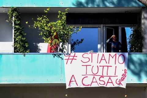 | "Nous sommes tous à la maison, merci" peut-on lire sur la façade d'un immeuble à Rome, le 11 mars. |