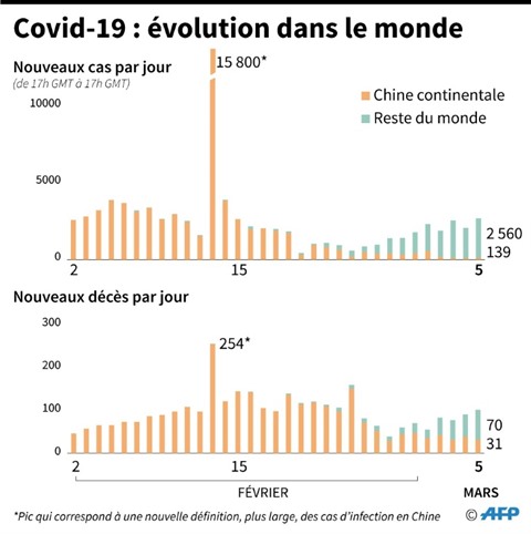 Le nombre de cas de contaminations dans le monde flirte avec les 100.000 : 85 pays et territoires ont relevé au moins 97.510 personnes infectées, et parmi elles, 3.346 en sont mortes, selon un bilan établi par l'AFP à partir de sources officielles jeudi 5 mars à 17h00 GMT.