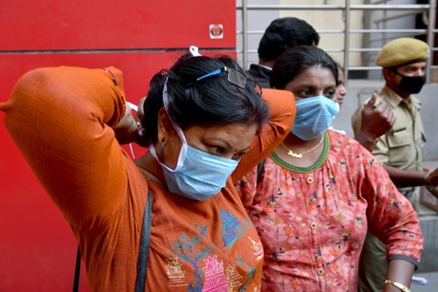 | Une femme ajuste son masque pendant une réunion d'information sur la prévention du nouveau coronavirus, à Bangalore (Inde) le 5 mars. |