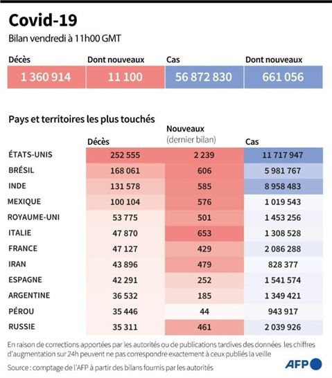 Plus de 56,8 millions de cas et 1,36 million de morts ont été officiellement recensés dans le monde depuis le début de la pandémie, selon un bilan établi vendredi 20 novembre par l'AFP.