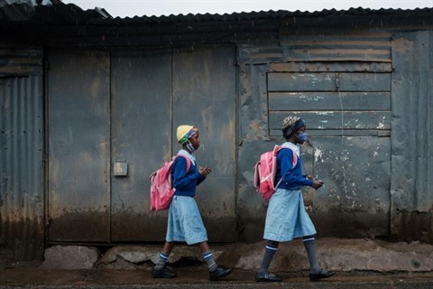 | Des élèves sur le chemin de l'école à Nairobi, le jour de la réouverture des écoles primaires ordonnée le 6 juin après un mois de fermeture pour lutter contre le COVID-19. |