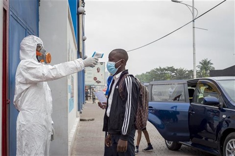 | Vérifier la température corporelle devant une école à Kinshasa. |