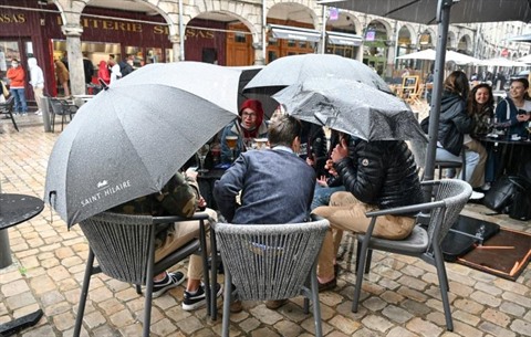| Des clients à une terrasse à Arras (Pas-de-Calais) malgré la pluie, le 19 mai. |
