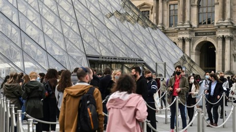 | Queue devant le musée du Louvre le 19 mai, jour de sa réouverture. |