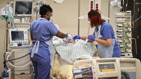 | Des soignantes autour d'un patient atteint du COVID-19, dans le service de soins intensifs de l'hôpital Avicenne de Bobigny (Seine-Saint-Denis), le 8 février 2021. |