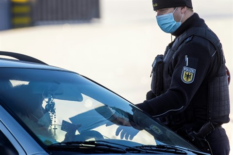 | Un policier fédéral allemand arrête un véhicule pour un contrôle à un poste frontière avec l'Autriche le 14 février 2021 près de Zinnwald. |