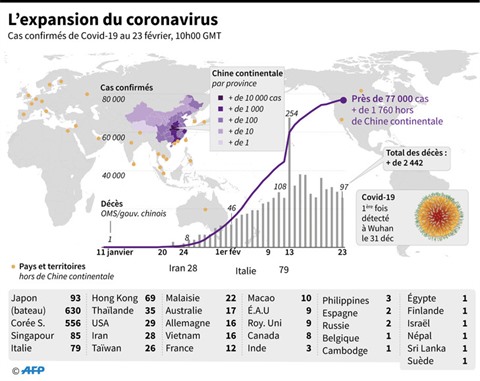 Le nouveau coronavirus a provoqué la mort de plus de 2.400 personnes, dont seulement 24 hors de Chine continentale, après son apparition dans la ville chinoise de Wuhan en décembre.