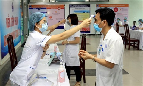 | Vérifier la température corporelle avant la vaccination anti-COVID-19 à Thai Binh (Nord), le 28 avril. |