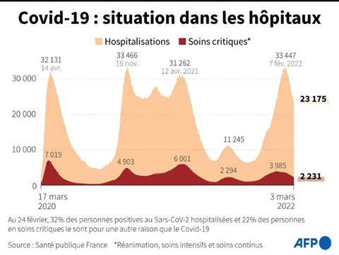 | Graphique montrant l'évolution des hospitalisations et des personnes en soins critiques en France, au 3 mars. |