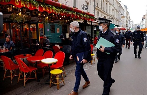 | Policiers patrouillant pour faire respecter les mesures sanitaires dans une rue de restaurants à Paris, le 6 octobre. |