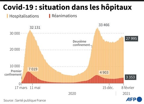 Environ 28.000 malades du COVID-19 étaient hospitalisés mardi soir 9 février, dont plus de 3.300 en réanimation, alors que 7.000 malades se trouvaient dans ces services au pic de la 1re vague, le 8 avril, et 4.900 au pic de la seconde, le 16 novembre.