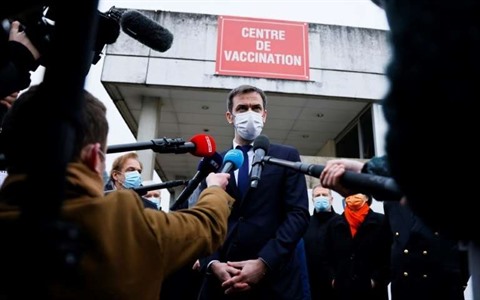 | Olivier Véran tient un point presse à Melun, le 8 février, après s'être fait vacciner. |