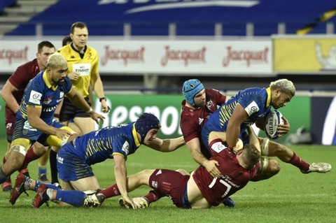 | Le Clermontois Sipili Falataea (balle en main) est plaqué par les joueurs du Munster en Coupe d'Europe au stade Michelin, le 19 décembre 2020. |