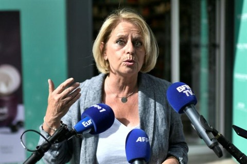 | La ministre de la Santé, Brigitte Bourguignon, s'exprime après avoir reçu une deuxième dose de rappel de vaccin anti-COVID, le 23 juin à Paris. |