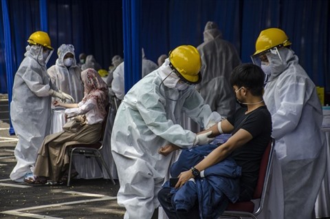 | Des agents médicaux prélèvent des échantillons pour le test rapide de COVID-19 dans la province de Java occidental en Indonésie. |
