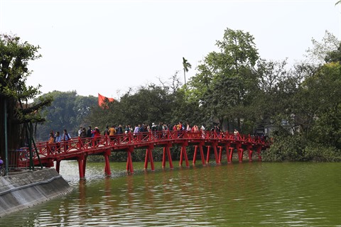 | Touristes sur le pont Thê Huc, au-dessus du lac de l'Épée restituée, à Hanoï. |
