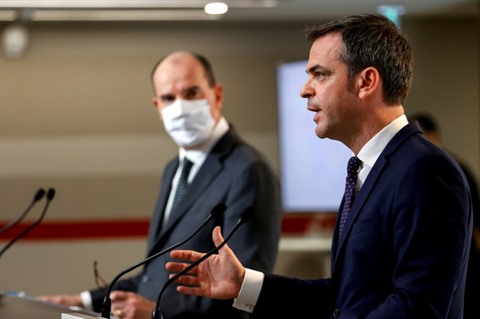 | Le ministre de la Santé Olivier Véran (droite) et le Premier ministre Jean Castex lors d'une conférence de presse à Paris le 10 décembre. |